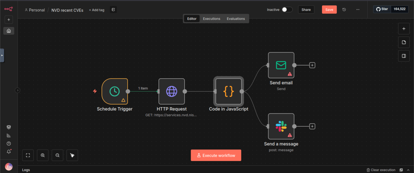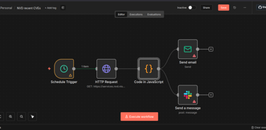 n8n is an open-source workflow automation platform designed to visually connect applications and services for task automation. Users build workflows composed of nodes, with each node representing an action such as making an API request, processing data, or sending an email. n8n is frequently used to automate repetitive operational tasks and to integrate security tools and SaaS platforms. Below is a simple example workflow that allows us to schedule an HTTP GET request to the NVD CVE API, format the output using JavaScript, and then send the report via email and to a Slack channel.